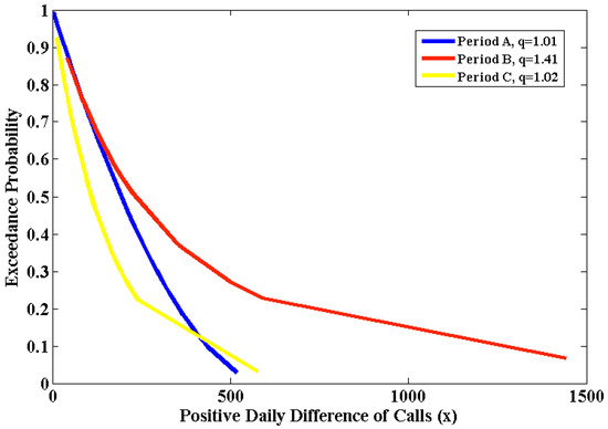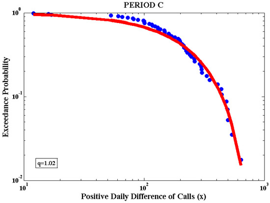 Parameter q is calculated by fitting Tsallis CCDF to the dataset using the Levenberg–Marquardt (LM) algorithm [23] (Figure 6). The LM algorithm is an iterative numerical procedure that is suited to solving nonlinear least squares problems [24,25,26]. Figure 7 shows the exceedance probability distribution function corresponding to each period for the 2010 cold wave. When the time series exhibits extremes (i.e., during the extreme weather period) the q value acquires its highest value and the distribution becomes “fatter” at the tail end, which means that the probability of getting high values of calls (x) is not small.