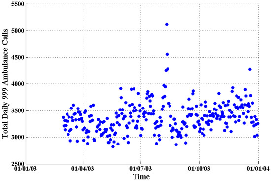 The daily total number of 999 emergency ambulance calls (blue dots) in London from 1 March 2003 to 31 December 2003.