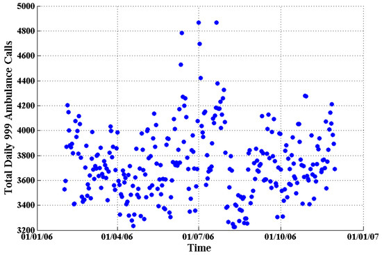 Figure 11 shows the daily total number of 999 emergency ambulance calls in London from 1 February 2006 to 30 November 2006. The minimum number of calls for this period is chosen to be equal to 3200.