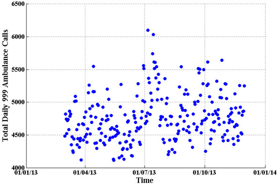 We examined 999 emergency ambulance calls in London from 1 April 2000 to 31 December 2014. The daily average number of ambulance calls during this period is 3904. Instead of analyzing the whole sequence of 999 emergency ambulance calls (see Figure 2), we chose to focus on four well-reported extreme temperature episodes in the UK as described in Thornes [19,20]. These specific episodes have health relevance. The Heat wave Plan for England [21] defines a heat wave in London expressed as two consecutive days at 32 °C with the night time temperature in between not dropping below 18 °C. On the other hand, the Cold Weather Plan for England [22] gives warnings when the mean temperature for the day is 2 °C or below, which was the case for 16 days out of 31 in December 2010 (Cold spell in December 2010, see Table 1). The choice to study well-documented extreme temperature episodes enables us to scrutinize the probabilistic nature of such episodes. In order to examine the fluctuations of the number of ambulance calls before, during and after the extreme temperature episodes, we selected broader time periods centered at the peak of each episode (for a detailed description see the Analysis section). These periods and the corresponding extreme temperature episodes are given in Table 1.