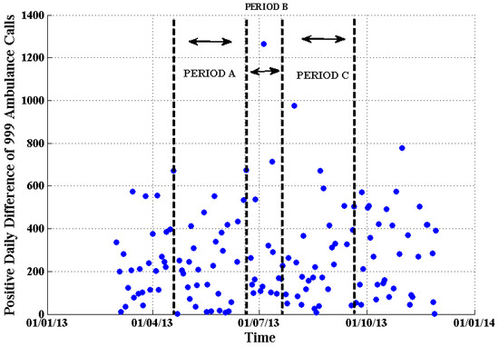 For each extreme weather episode, we specify three periods. We define the extreme weather period as Period B. This is a period of one month in duration centered at the peak of the positive daily difference of calls (Figure 5). Other durations were chosen for sensitivity analysis purposes (see below). Although usually extreme temperature episodes last for a few days (few events) we choose a period of one month in order to have a sufficient number of events (31 events) for calculating the associated probability distribution. Using the actual number of days that concern the extreme temperature episode would lead us to a poor estimation of the probability distribution due to the small number of events selected. We define further two associated periods, one before (Period A) and one straight after (Period C) the extreme weather period (Period B). Periods A and C are two-month periods where we expect “normal” numbers of calls (i.e., corresponding to “normal weather conditions”) to be recorded.