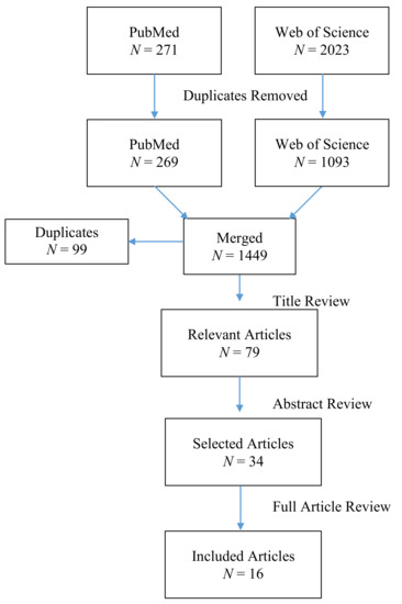 The systematic search resulted in 271 journal articles from PubMed, with 229 unique titles, and 2023 journal articles from Web of Science, with 1093 unique titles (Figure 1). Once merged, there were 1449 unique scientific journal articles. Next, we reviewed the journal titles and selected 79 relevant articles. During the title review, reasons for articles to be excluded included: (1) were not conducted in the United States; (2) indicated a focus on developing models to estimate PM2.5 emissions, source apportionment, or plumes; (3) conducted an occupational exposure study; (4) measured other air contaminants; (5) indicated that they were conducted in a laboratory. Of the selected articles, we reviewed their abstracts for extractable information that was relevant to the synthesis objectives. Based on the information provided in the abstracts, such as study methods and results, we selected the article to be further reviewed by reading the full article (N = 34). Sixteen peer-reviewed scientific journal articles met the study criteria and were included in this synthesis.