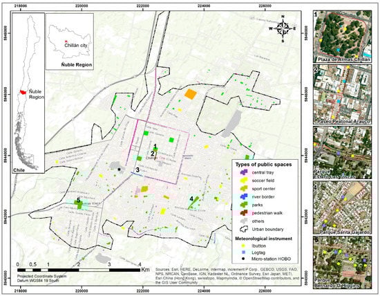 Finally, it is worth mentioning the Adapting Cities Plan to Climate Change [], which has recently concluded a citizenship consultation process. The plan is focused on the risks involved in climate change at national level. The concept of urban climate is absent and, hence, the concern for temperature is restricted to the events of heat and cold waves, which are usually recorded by meteorological stations installed outside the urban limits, such as the station Bernardo O’Higgins in Chillán. It is essential that planning instruments consider urban climatology to understand the necessary relationships between the characteristics of planning, urban design, and climate, which, in turn, affect thermal comfort and climate quality in each sector of the city.