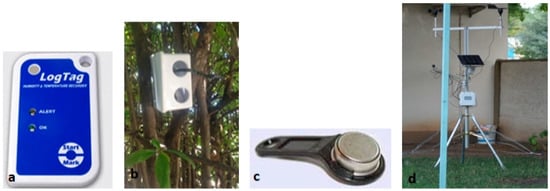 Meteorological instrument installations. Note: (a) Logtag recorder; (b) Logtag recorder installation in the box; (c) Ibutton data logger; and (d) meteorological micro-station HOBO.
