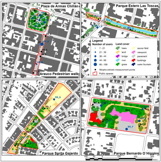 Except for Paseo Peatonal Arauco, 98% of whose area is paved, all public spaces selected in Chillán have green patches covered with grass: 41% Plaza de Armas, 38% Parque Monumental Bernardo O’Higgins, 34% Parque Sarita Gajardo and 20.5% Parque Estero Las Toscas (Figure 3).