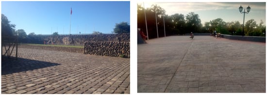 The smallest paved area is in Parque Sarita Gajardo. It represents only 5.4% of the total area, with 3% occupied by two multi-courts. In Parque Monumental Bernardo O’Higgins, the paved area accounts for 38% of its territory, 10% of which is a viewpoint (Figure 4) at six meters high.