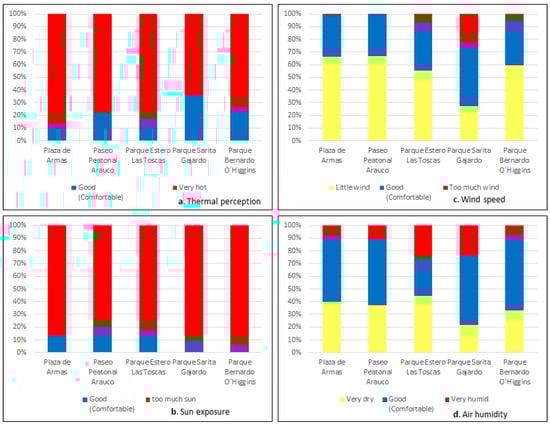 During daytime, air humidity registered in the checkpoints located inside the selected public spaces ranges from 45% to 55%. Within the sample, humidity and wind speed show a similar perception. During the afternoon, most people choose the option “too dry”. On the other hand, at noon, this alternative and “comfortable” show equivalent results (Figure 8d). Even though Parque Estero Las Toscas is located in a stream bank, it has the highest proportion of uncomfortable users because of air dryness. In the remaining public spaces, satisfaction with this parameter is approximately 50%.
