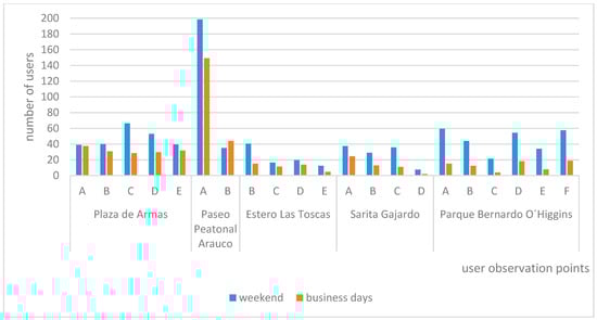 The observation of visitors complemented the data obtained through the survey. There are significant differences in the flow of users, depending on the social role of each public space. Thus, Plaza de Armas and Paseo Peatonal Arauco receive a greater number of attendants on Monday through Friday. With respect to the latter, the weekend studied constitutes an exception to the above in point A (PP_A in Figure 4), since a folkloric festival took place on Saturday, 30 January, at 19 h. On the other hand, the parks evaluated—Parque Sarita Gajardo and Parque Monumental Bernardo O’Higgins—concentrate their visitors on Saturdays and Sundays (Figure 9).