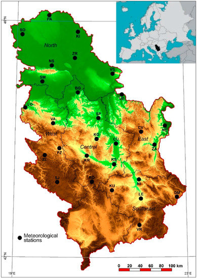 - Ducić, V.; Radovanović, M. Climate of Serbia; Zavod za Udzbenike i Nastavna Sredstva: Belgrade, Serbia, 2005; pp. 1–212. ISBN 86-17-12290-0. [Google Scholar]