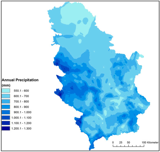 The map of annual precipitation in Serbia (1961–2010) [41].