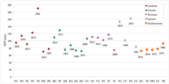 Maximum daily precipitation (MDP) for 28 stations grouped in five regions for the period of 1961–2015 in Serbia.