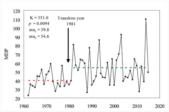 Results of the Pettit test showed, at a confidence level of 0.05, that there was a significant sudden shift upward for the research period, but only for the station at Loznica (Figure 4). As a transition year for MDP, the year 1981 was detected. The average annual values of MDP were 39.8 mm before the transition year, and 54.6 mm after the transition year.
