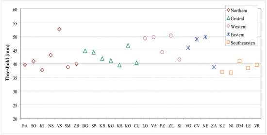 Regional differences are presented in Figure 5. Dry southeastern Serbia is most susceptible to precipitation events (even at a precipitation level of 36.6 mm), while northern Serbia is slightly less at risk. The more protected parts of the country include the western and central regions, in which the threshold values move to above 40 mm (Table 5). At mountainous meteorological stations (Kopaonik, Zlatibor, and Crni Vrh), the thresholds of dangerous precipitation were higher than at lowland stations; the lowest threshold was registered at the meteorological station at Kopaonik (46.7 mm). As a result, the threshold of warning for a territory above an altitude of 1000 m should be set at about 45 mm. According to these results, it can be concluded that, in case of extreme rainfall in Serbia, warnings should be spatially differentiated in accordance with the weather forecast and the lowest value of the defined thresholds for heavy precipitation events.