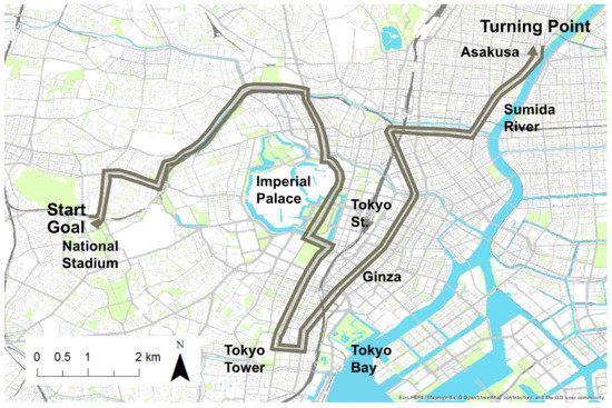 This study focuses on the scheduled marathon course for the 2020 Tokyo Olympics (see Figure 1). Runners will start the marathon at the New National Stadium, then pass the Imperial Palace Square, Tokyo Tower, Ginza district and other landmarks in Central Tokyo. They will then reach a turning point at Asakusa, the heart of the old downtown district, where they will double back along the racecourse, finishing the race at the New National Stadium.