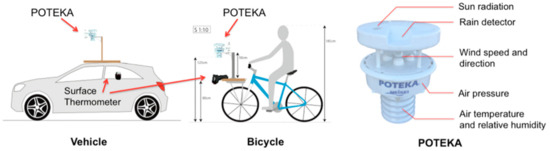 Cars and bicycles equipped with weather observation instruments made return trips along the planned marathon course to measure heat conditions along the marathon route. Measurements were conducted in the left-hand traffic lane because runners must run in the left-hand traffic lane in principle, according to the Japan Association of Athletics Federations. This study measured five meteorological elements: air temperature, humidity, solar radiation, road surface temperature and wind speed using the sensors shown in Figure 2. Table 1 provides a list of the weather observation instruments used in this study. POTEKA is a compact weather observation instrument developed by Meisei Electric Co., Ltd. (Isesaki, Japan) that measures temperature, humidity, solar radiation and wind speed. Surface temperature data were collected by infrared camera, Thermo GEAR G100 (Nippon Avionics Co., Ltd., Shinagawa, Japan). These meteorological elements were linked to ground position using an eTrex 30 GPS (Garmin Ltd., Olathe, USA).
