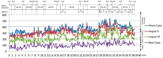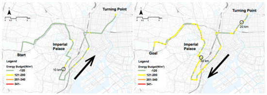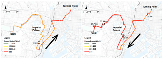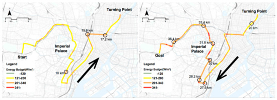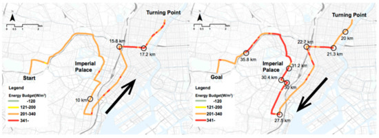 Figure 5 and Figure 6 display the results for the worst-case scenario. In comparison to August 9, the worst-case scenario has higher humidity and lower wind speed. Therefore, the energy budget is higher throughout the entire race, with stretches considered extremely dangerous beginning at the start of the outward transect. The levels of solar radiation in the worst-case scenario show the most intense solar conditions, however, still providing variability due to building and vegetation shading. On August 9, according to data from the Japan Meteorological Agency, at the time of the data collection at the 35.9-km mark, it was overcast, and the Sun was obscured. Therefore, on August 9, the energy budget values after the 35.9-km mark were low. However, the worst-case scenario virtualized clear sunny days, and therefore, the values did not decrease after the 35.9-km mark and exceeded the extremely dangerous threshold from 27.5 to the goal. Based on these results, this section of the route is considered as have a particular need for improvements of the thermal conditions.