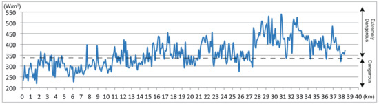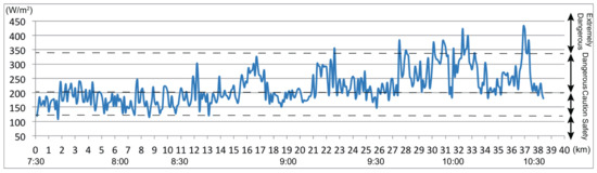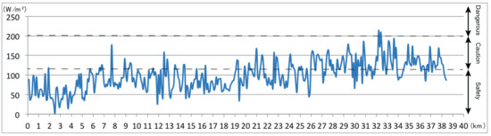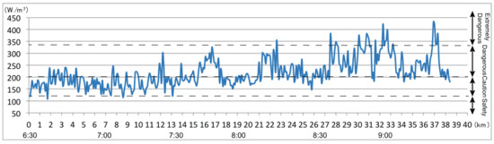 Figure 9 and Figure 10 show the results for August 25. There is a series of dangerous sections on the outward route, but no spots on the outward course are evaluated as extremely dangerous. On the homeward route, just as on August 9 and in the worst-case scenario, high energy budget values are observed from the 27.5-km mark onwards. However, from 28.2–29.9 km and 33.4–36.4 km, the energy budget was lower than those in the surrounding areas. Therefore, as expected, the length of the extremely dangerous area on August 25 is shorter than that of the worst-case scenario. This is largely due to the fact that measurements began an hour earlier than usual, and thus, the solar radiation was at a lower intensity, as well as a significant amount of shade from buildings and trees lining the course remained present.