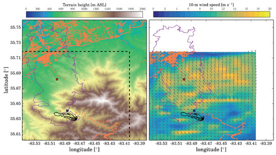 To illustrate how the forecasting system can be used to minimize the impact of wildland fires, we present simulations that could have been performed during the evolution of the Chimney Tops II fire. This fire was selected due to its large socio-economic impacts. The fire occurred in the Great Smoky Mountains National Park, Tennessee. It was first identified on 23 November 2016 at around 1730 LST in an abrupt region of the park. On 28 November 2016, the dry conditions and extreme winds led to a rapid intensification of the fire. The fire burned 17,140 Acres (purple solid line in Figure 1) and destroyed 2013 homes, 53 commercial structures and caused 14 fatalities. Our simulations of this fire show the value that high spatial resolution winds, fire spread and smoke forecast could bring to minimize the socio-economic impacts of wildland fires.