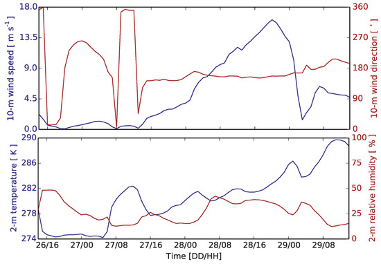 Several atmospheric processes are parameterized in WRF. These include both shortwave [16] and longwave [17] radiative transfer. Cloud microphysical processes are parameterized with the WRF single-moment six-class scheme [18] and land–atmosphere processes follow [19,20]. The surface layer parameterization is based on the Monin–Obukhov similarity theory [21]. The representation of turbulent mixing differs in the two domains. In Domain 1, turbulence is parameterized based on the assumption of horizontal homogeneity [22], whereas, in Domain 2, turbulence is explicitly resolved with a large-eddy simulation closure [23,24]. This improved representation of turbulence is desirable to resolve the fine atmospheric scales that drive the fire module activated in this second domain.