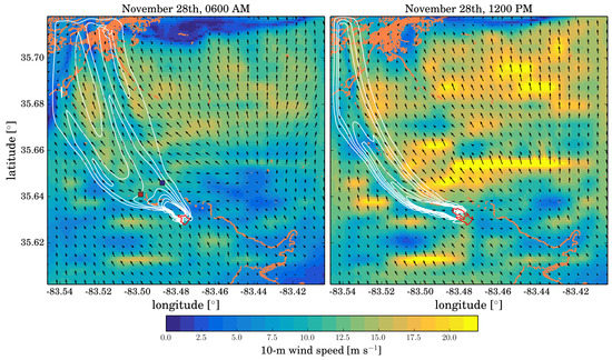 Smoke concentrations (white contour lines) from SIM1 at (left) 0600 LST and (right) 1200 LST on 28 November. The winds (arrows) and the wind speed (shaded) are also shown. Orange colors represent no fuel categories such as the city of Gatlinburg in the northwest of the domain and US-441 road in the southeast.