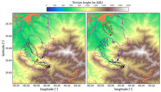 Despite the potential of coupled atmosphere-fire models for fire spread forecast, this kind of models is not used in fire incident management today. The standard practice is to drive a particular fire spread model with an external meteorological forecast. This is an efficient methodology but presents certain limitations. A first limitation is that operational models are not typically run at the fine scales that drive the fire behavior. Finer wind fields could be obtained using diagnostic models based on mass-conservation [11,12]. However, this kind of models would not increase much the temporal resolution of the meteorological forecasts (approximately 1 h). Higher temporal resolution is important when analyzing fire phenomena at fine atmospheric scales. Over the contiguous U.S., the finest meteorological forecasts available is the High Resolution Rapid Refresh (HRRR) model run by NOAA [13] at a grid spacing of 3 km. Although this horizontal resolution can be considered high for certain NWP applications, it is not sufficient to capture relevant terrain features over regions of complex topography, fuel heterogeneities, or the fine atmospheric scales of motion that drive the fire evolution. In addition, using an external meteorological forecast prevents one from accounting for fire–atmosphere feedbacks that have shown relevance for particular wildland fires [2,3].