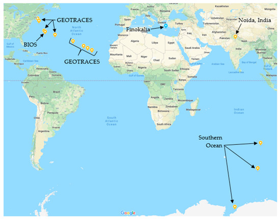 Samples from five different locations were used to capture aerosols with marine, anthropogenic, and/or mineral dust influences: India, Bermuda, Crete, and Atlantic and Southern Ocean transects. These locations are illustrated in a map shown in Figure 1.