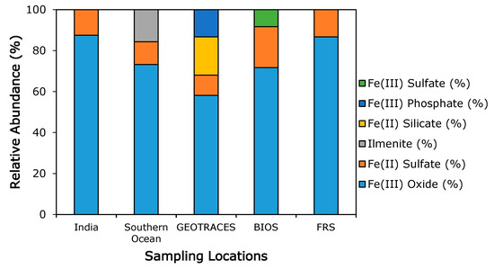 A total of 157 individual particles were examined for iron mineralogy across the five different sample sets. Individual particles were generally more diverse in mineralogy than the bulk mineralogy (Table S7). Individual particles sampled from India belong to three mineralogical groups and were either dominated by Fe(III) oxides or Fe(II) silicates. Individual particles sampled from the Southern Ocean contained a combination of Fe(III) oxides and Fe(II) sulfates or were dominated by Fe(III) phosphates. Individual particles from Finokalia Research Station contained largely iron oxides. Some particles also contained minor quantities of ilmenite, an iron oxide containing titanium. Individual particles sampled from Finokalia Research Station also contained ilmenite but were largely dominated by Fe(III) oxides. Individual particles from Bermuda were largely a mixture of Fe(III) oxides and Fe(II) silicates. Individual particles sampled from the GEOTRACES transect had a strong presence of Fe(II and III) sulfates and Fe(III) phosphates with only minor contributions from Fe(III) oxides. The general dominance of iron oxides and sulfates was also seen in these individual particle analyses. In general, the phases identified in individual particles were consistent with the ones observed in bulk samples. In contrast to bulk spectra, which often have contributions from several different iron minerals, individual particle spectra were typically easier to fit with Athena [61]. Identification of phases in the individual particles supports their choice when modeling bulk spectra. Bulk spectra should be viewed as more representative of the overall iron mineralogy of a sample because they access particles across the entire spectrum of size ranges present in a sample.