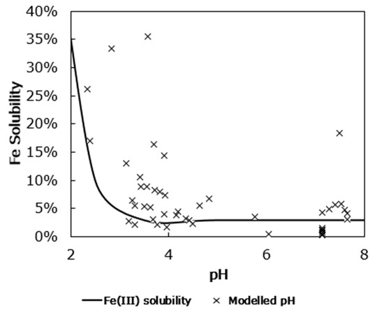 Correlation seen between inorganic acids, sulfuric acid, and nitric acid, and the solubility of aerosol iron had been used as evidence for acidic reactions promoting the solubility of iron in mineral dust [47,72,73]. Here, there was no relationship between total inorganic acidity (sum of sulfuric and nitric acids) (R2 = 0.0016), nitrate (R2 = 7 × 10−6), or non-sea-salt sulfate (R2 = 0.17) and the fractional solubility of iron. However, when pH was modelled with ISORROPIA [56,57], a trend indicates one possible explanation (Figure 4). When the pH is approximately neutral, a range from approximately 4 to 8, the solubility of iron is relatively low, but as the pH drops below 4, the fractional solubility of iron rapidly increases, up to nearly 35%. This behavior is consistent with the speciation of Fe(III), determined using the standard selection in the Mineql+ database to create an Fe(III) speciation diagram [74], where below a pH of approximately 3, the abundance of dissolved Fe(III) sharply increases [75,76,77]. This suggests that dissolved Fe(III) production is a consequence of acidic reactions in the atmosphere as would be expected for acidic species acting on a largely Fe(III) oxide composition. So only in the acidic range, when sufficient acidic species have aggregated on a particle, can the protons act to solubilize iron.