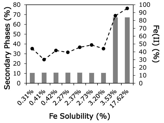 In samples from the GEOTRACES collection, the fractional solubility of iron was higher when more Fe(II) (black line) was present or when more secondary phases (grey bars) were present. Secondary phases include Fe(II and III) sulfates and iron phosphates; these compounds are collectively labeled as secondary phases because these are phases that may form through secondary reactions that occur in the atmosphere. However, such secondary phases may also be initially present in aerosols derived from coal fly ash or volcanic materials.