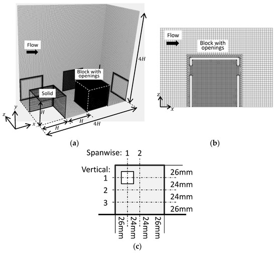Here, and represent the streamwise mean wind speed and opening area at simulation node located in the opening. The conventional method in Equation (1) is thought to estimate this ventilation rate by approximating the flow introduction speed based on pressure differences. The net ventilation rates are thought to be more accurate than the conventional method; however, the wind speed averages in openings are needed for determination. The wind speed averages in openings were determined by simulated results for calculating the net ventilation rates for each case.