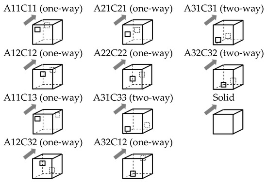 In the same manner, vertical sectional flow fields in the windward openings of all cases were visualized and classified into the following two types: the one-way type is characterized by air flows that are unidirectional, such as the downward diagonal of A12C12, and the two-way type is characterized by air flows that are introduced into the room at the bottom edges of the openings and ejected out from the room in the upper regions of openings, such as A32C32 and A31C31. Following this classification, the three cases of A32C32, A31C31, and A31C33 were two-way, and the other seven cases were one-way (schematic figures are summarized in Figure 9).