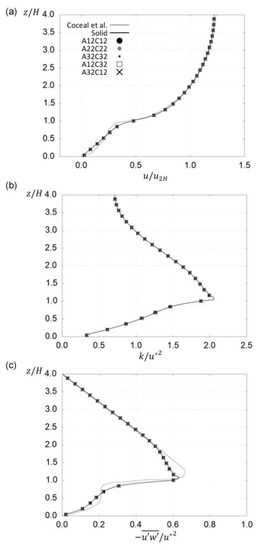 for six selected cases of Solid, A12C12, A22C22, A32C32, A12C32, and A32C12. Reference profile data of velocity and Reynolds stress are obtained from Coceal et al. [