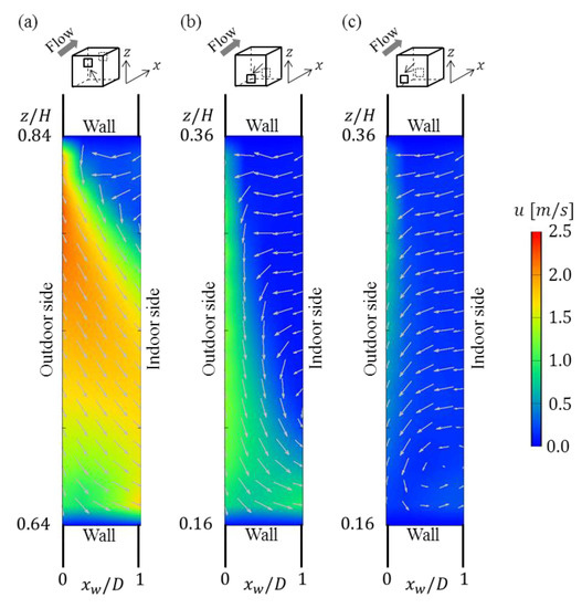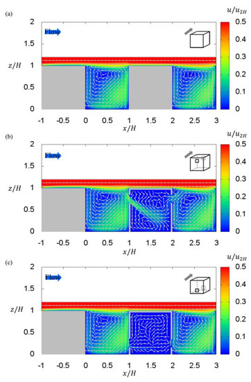 Figure 7 shows vertical sectional flow fields in windward openings at the spanwise centres of the three typical cases.