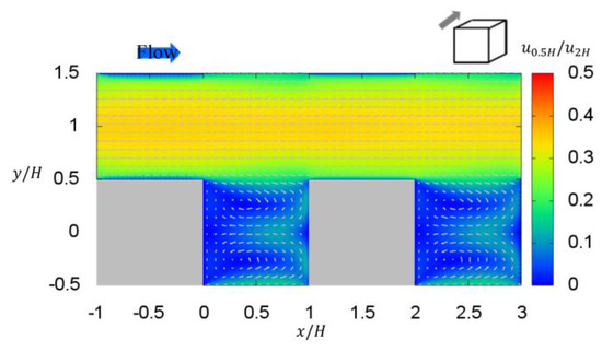 28]. The vertical Reynolds stress is calculated based on gradient transport theory with the eddy viscosity. The values inside the block are excluded from spatial averaging to compare flows of outdoor spaces. The wind speed is normalized by the reference wind speed defined at
