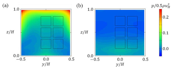 Figure 6a,b show the pressure coefficient distributions of the Solid case’s windward and leeward walls, respectively. The rectangles on the figures represent the opening locations of the other cases. On the windward wall, the pressure values generally become larger at higher locations. On the upper half of the buildings, larger pressure values can be observed along the edges, whereas on the lower half, pressure is higher near the spanwise centre. This is because fast winds blow against the building’s upper parts, resulting in a large dynamic pressure contribution to the wall pressure. Conversely, in the building’s lower parts, wind flows toward the spanwise centre along with the windward wall due to counter vortices, which are attributed to the small wall pressure because of the large dynamic pressure of the flow itself.