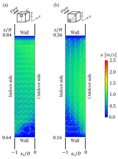 Figure 8 shows the vertical sectional flow fields in the leeward openings for two typical cases. Horizontal axis
