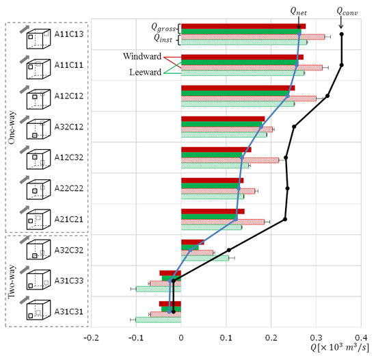 indicates expected values when TKE increased 30%. In general, both windward and leeward openings in the higher row (A11C13, A11C11, and A12C12) produced high ventilation rates. In contrast, cases where the openings were in the bottom row on both windward and leeward walls (A32C32, A31C33, and A31C31) produced low ventilation rates. These results are considerably natural because inlets or outlets in upper positions can be exposed to flow with larger wind speed. Moreover, surprisingly, A31C33 and A31C31 showed reversed ventilation, indicating that the net flow direction was from the leeward opening to the windward opening (