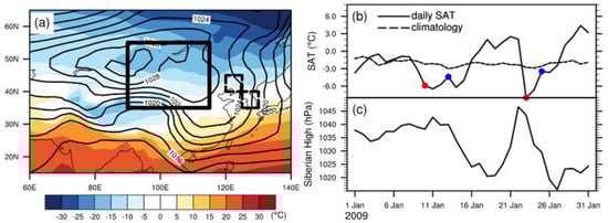 (a) The SAT domains of East Asia (two dashed boxes; 35° N–40° N, 125° E–130° E and 40° N–45° N, 120° E–125° E) and the domain of the Siberian High (solid box; 35° N–55° N, 90° E–115° E) used to define cold surges. The climatology of observed mean SLP (contour interval of 2 hPa) and SAT (shading) during the winter season (November to March). (b) Times series of daily SAT (solid line) and its climatology (dash line) averaged over 35° N–40° N, 125° E–130° E during January in 2009. Red (blue) dots indicate the occurrence (termination) date of CSs. (c) Time series of daily SLP averaged over the domain of Siberian High during the same period mentioned in Figure 1b.