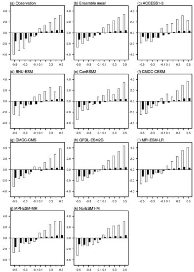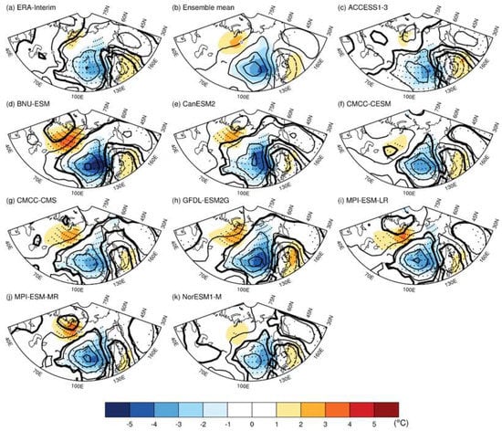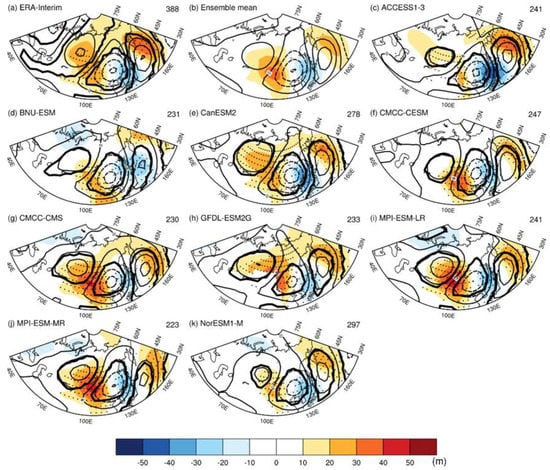 The geopotential height patterns at 250 and 850 hPa are shown during the dates of CS occurrence in observation (Figure 2a). The upper-tropospheric ridge-trough-ridge geopotential height pattern stretches from the Ural Mountains (50° E–90° E, 50° N–75° N) to the Korea–Japan region (120° E–140° E, 30° N–45° N). The ridge-trough-ridge is arranged in a northwest–southeast direction in the upper troposphere and the anticyclonic–cyclonic couplet stretches from eastern flank of the Siberian High to East Asia in the lower troposphere. These upper- and lower-tropospheric synoptic patterns proceed eastward and imply a westward-tilted vertical structure in which the lower-level circulation leads the upper-level circulation by about a quarter of a wavelength. The westward-tilted vertical structures in geopotential height associated with CSs in the ensemble mean and all nine CGCMs are similar to the observed structures [35]. However, the magnitude and location of the geopotential heights are slightly different in each model (Figure 2c–k). In ACCESS1-3, BNU-ESM, CanESM2, CMCC-CESM, and GFDL-ESM2G, the magnitude of the upper-level ridge over the Ural Mountains is underestimated (Figure 2c,f,h). The strong lower-level anticyclone over the Lake Baikal is simulated in CMCC-CMS, MPI-ESM-LR, and MPI-ESM-MR (Figure 2g,i,j). In BNU-ESM, the direction of the lower-level anticyclone–cyclone couplet is more northward than the observation (Figure 2d).