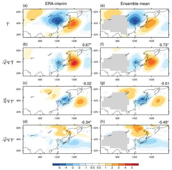 Figure 4 shows the temperature anomaly (Figure 4a,e) and the temperature advection terms in dates of CS occurrences (Figure 4b,d,f,h). The temperature anomaly patterns show that the cold anomaly approaches East Asia, leading to large temperature drops (Figure 4a). The role of each temperature advection term is explored based on its spatial pattern and spatial correlation coefficient with temperature anomaly pattern. When the negative (positive) area is located over East Asia, this temperature advection term contributes cold (warm) advection over East Asia. The climatological temperature advection by anomalous wind pattern (Figure 4b) induces cold advection over East Asia. This advection contributes to sustain and amplify cold anomaly located over East Asia. Spatial correlation coefficient between temperature anomaly and the climatological temperature advection by anomalous wind is 0.67, which means the advection generally amplify temperature anomaly pattern. Anomalous temperature advection by climatological wind induces cold (warm) advection on the eastern flank of cold (warm) anomaly (Figure 4c). It means climatological north-westerly in winter moves the cold and warm anomaly eastward which does not induce cold advection over East Asia. The anomalous temperature advection by anomalous wind induces slightly weak cold (warm) advection into the southern (northern) part of East Asia (Figure 4d). The cooling (warming) in mid-latitude (high-latitude) regions may imply meridional energy exchanges. Each temperature advection term in the ensemble mean shows a similar spatial pattern to the observations and their spatial correlation coefficients are also similar with the observations (Figure 4e,h). Therefore, the climatological temperature gradient plays a critical role for the intensity of the cold advection that eventually leads to the development of CSs by carrying cold air into East Asia. The temperature distribution in the lower troposphere would change CS occurrence through the variation of cold advection.