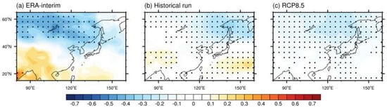 On the interannual time scale, the thermodynamic environment (i.e., mean state of SAT) affects the frequency of CSs. Figure 6 shows the spatial patterns of the interannual correlation coefficients between the mean number of CS occurrences over East Asia and the mean SAT in each winter for both the observations and the ensemble means of the historical and future CGCM runs. In the observations, negative and positive correlation coefficients are located over northern and southern regions, respectively (Figure 6a). The area of negative correlation coefficients spreads zonally from the northern regions of Mongolia to East Asia. If the northern surface air is cold and the meridional SAT gradient steepens, the conditions are favorable for CS genesis. While the regions with negative correlation coefficient are rather different in the historical run and the RCP8.5, both display negative correlation coefficients over the northern part of East Asia (Figure 6b,c). In the historical run, the center of negative correlation coefficient is located over the northeastern regions of the analysis domain, while in the RCP8.5 run, the center is located over the northern regions. The difference in the location of the negative correlation coefficients may be due to the difference between blocking and wave-train CSs [33], which were not considered in this study and there are limitations to simulate the positive correlation coefficient over the southern regions in CGCMs. The meridional SAT gradient over eastern Eurasia has a crucial role for the frequency of CSs in interannual time scale, which could support the importance of thermal structure for predicting the number of CS occurrences in future climate.