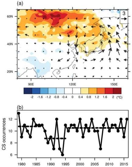 The importance of cold advection associated with SAT structure to CS occurrence can also be seen on decadal time scales. We divide the observational analysis period of 38 years into three periods: 1979–1987, 1988–1994, and 1995–2016 (Figure 7). The number of CS occurrences in 1979–1987 and 1995–2016 are 10.8 yr−1 and 10.5 yr−1, respectively. However, fewer CSs occur (8.8 yr−1) in 1988–1994. During the period of 1988–1994, the SAT warming over Northern Eurasia decreases the meridional SAT gradient, especially since the center of the warming occurs in the northern part of the Siberian High (Figure 7a). The reduced meridional SAT gradient from the center of Siberian High to East Asia would lead to relatively warmer air by northerly in-weather systems in the region, providing unfavorable conditions for CS occurrence. The decadal changes in CS frequency described in Figure 7b are consistent with previous studies [15,37]. In sum, CS occurrence is closely associated with low-level thermodynamic environments, especially the meridional SAT gradient over East Asia on decadal time scale.