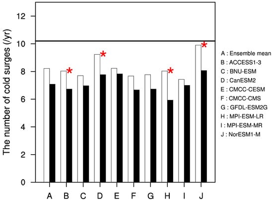 The number of cold surge occurrences (yr−1) in winter from 1979–2016 in observations (horizontal black line) and the historical (1975–2005; white bar), and future (RCP8.5; 2065–2095; black bar) from 9 CGCMs and their ensemble means (significant changes at 95% confidence level are represented by red stars).