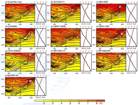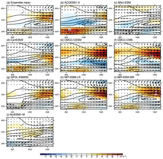 In addition, circulation changes related to the EAWM and AO can affect SAT patterns in the lower troposphere. The EAWM is related to the circulation structure over East Asia, so we examined the projected changes in circulation patterns in the upper and lower troposphere in the future (Figure 10). The East Asian westerly jet stream is projected to shift poleward in the ensemble mean (Figure 10a). CMCC-CESM, CMCC-CMS, MPI-ESM-LR, and MPI-ESM-MR simulate particularly strong poleward shifts (Figure 10e,f,h,i). The enhancement of the jet stream on the northern flank of jet stream’s core is a noticeable feature of weak EAWM years [38]. Projected changes in zonal wind at 250 hPa are similar to the pattern in weak EAWM years. In the lower troposphere, zonal wind is projected to intensify over the regions where the East Asian westerly jet intensifies. On the other hand, zonal wind at 850 hPa is projected to decrease over low-latitude regions. This anticyclonic change dominates over the western North Pacific around 40° N as the weak EAWM pattern does. Both the upper and lower level circulation changes imply a climatological weakening of the EAWM and a decrease in the number of CS occurrences in the future due to weakened cold advection.