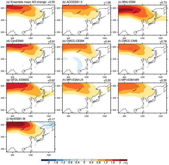 The AO can also affect CS occurrences over East Asia by modulating atmospheric circulation [13,14]. All CGCMs successfully simulate the AO pattern, in which negative SLP anomalies are located over the Arctic Ocean and positive SLP anomalies are located over the North Pacific and North Atlantic, as determined by empirical orthogonal function analysis (not shown). Regression analysis of the historical run shows that the SAT gradient is reduced from Mongolia to East Asia in the positive AO phase (Figure 11). The projection value between the AO loading pattern and the mean SLP change in future climate is positive in all the CGCMs, with a value of +0.55 for the ensemble mean. The AO-related temperature change is expected to reduce the meridional SAT from Mongolia to East Asia, preventing the northerly from bringing cold air to develop CSs. Thus, the likely influence of the AO on East Asia in the future would be to provide unfavorable conditions for CS occurrences.