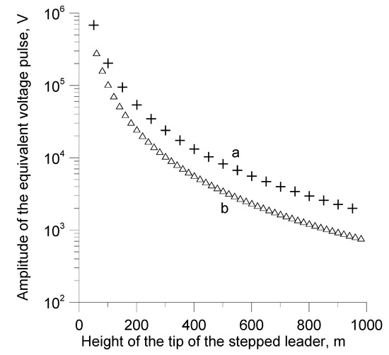 Amplitude of the voltage pulses that are needed to be applied to the tip of a lightning rod to simulate the electric field changes caused by the stepping process of the stepped leader. (a) 50 m step length. (b) 20 m step length. The prospective return stroke current associated with the stepped leader is 30 kA. The length of the lightning rod is 10 m.