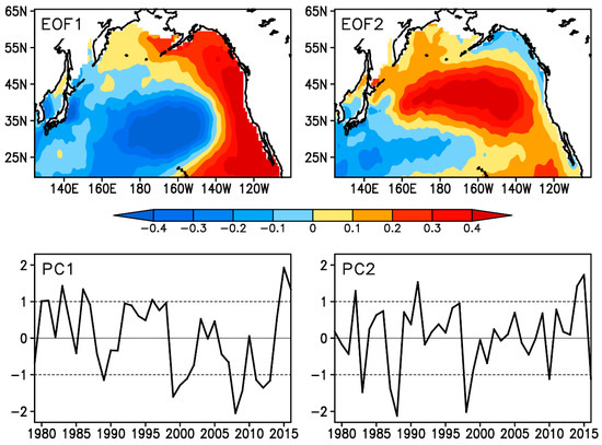 Previous studies reported that the VM is an SST footprint forced by the North Pacific Oscillation (NPO)-like atmospheric variability [28]. The NPO is strongest in winter (December–February (DJF)) [34], while the VM reaches peak around spring (February–April (FMA)) as a delayed response to the NPO forcing [28]. Therefore, we performed EOF analysis of FMA-averaged SST anomalies over the North Pacific poleward of 20° N (after removing the global mean SST anomaly) (Figure 2). The leading EOF mode (EOF1), which explains 27.3% of the total variance, exhibit a basin-wide horseshoe-like spatial pattern over the North Pacific, with SST anomalies of one sign in the western and central North Pacific surrounded by anomalies of the opposite sign along the west coast of North America. This mode is conventionally referred to as the Pacific decadal Oscillation (PDO) [35,36]. The EOF2, which explains 14.2% of the total variance, exhibits a tilted SST anomaly dipole pattern oriented in the northeast–southwest direction, characterized by a band of positive SST anomalies in the northeastern North Pacific and a band of negative SST anomalies extending from the central North Pacific to the WNP. This mode is referred to as the so-called VM [26,27,28]. The VM index (VMI) is defined as the second principal component (PC2) time series associated with the EOF2. A strongly positive (negative) VM case is defined as a year in which the VMI exceeds one positive (negative) standard deviation for the period 1979–2017 (Table 1).