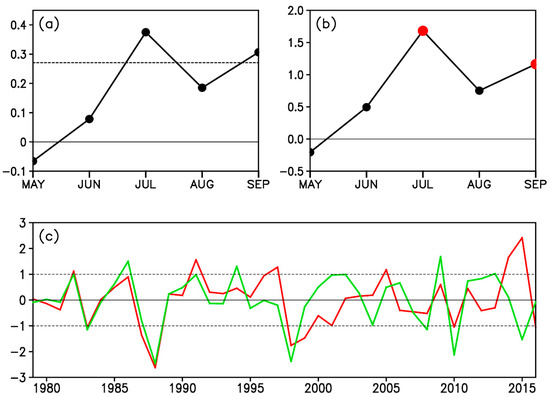 (a) Correlations of the February–April (FMA) VM index (VMI) with monthly SCSSMI from May to September. The horizontal dashed line shows the 90% confidence level; (b) Composite differences in the monthly evolution of the SCSSMI between strongly positive and negative VM cases. Red closed circles indicate the values significant at the 90% confidence level; (c) Time series of the FMA VMI (red line) and the following June–September (JAS) SCSSMI (green line).