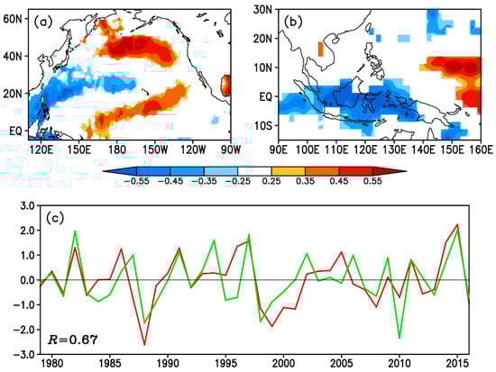 Spatial properties of the leading singular value decomposition (SVD) mode for (a) the FMA SST anomalies in the North Pacific (20° N–65° N, 125° E–100° W) and (b) the following JAS precipitation anomalies in the SCS (South China Sea) monsoon region (0°–22° N, 110° E–120° E), shown as correlation maps of the respective heterogeneous SST and precipitation fields with the SVD leading normalized expansion coefficients. Areas with the correlation coefficients significant at the 90% confidence level are shaded. (c) The SVD leading normalized expansion coefficients of the FMA SST field (red line) and the following JAS precipitation field (green line).