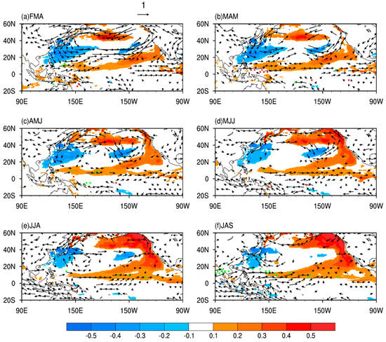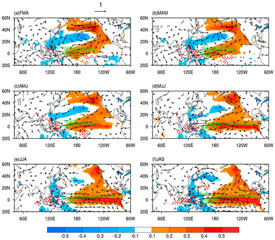Regressions of the 3-month averaged SST (shading), wind vectors at 850 hPa (vector), and precipitation (stippled) anomalies onto the FMA VMI for FMA (a); MAM (b); AMJ (c); MJJ (d); JJA (e); and JAS (f). Positive (red) and negative (blue) SST anomalies, significant at the 90% confidence level, are shaded. Positive (green) and negative (red) precipitation anomalies significant at the 80% confidence level are stippled. Only 850 hPa wind vectors significant at the 90% confidence level are shown.